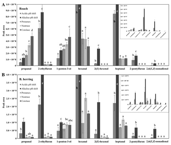 Peak areas of seven oxidation related volatiles, analyzed using headspace solid-phase microextraction-gas chromatography-mass spectrometry, in protein isolates from roach (A) and B. herring (B). Different letters indicate a statistically significant difference (p < 0.05) between samples.