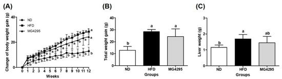 Effect of the L. fermentum MG4295 on (A) change in body weight gain, (B) total weight gain, and (C) liver weight gain in HFD-induced mice for 12 weeks. The results are presented as mean ± SD (n = 8). Different letters indicate a significant difference at p < 0.05.