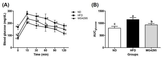 After 12 weeks of administration, an OGTT was performed to evaluate glucose tolerance (Figure 2). The HFD-induced group showed greater glucose content represented as AUC after oral glucose loading and glucose tolerance test compared to the ND group (p < 0.05) (Figure 2A). Moreover, administration of L. fermentum MG4295 caused a significant reversal of the disrupted glucose homeostasis induced by the HFD diet (Figure 2B).