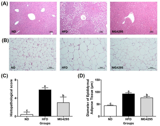 Histopathological alterations in the liver and epididymal adipose tissues. Representative photographs of H&E-stained liver tissues (A) and epididymal adipose tissues (B), histopathological scores of liver tissues (C), and diameters of epididymal adipose tissues (D) in HFD-induced mice. Scale bars = 100 μm. The results are presented as mean ± SD (n = 8). Different letters indicate a significant difference at p < 0.05.