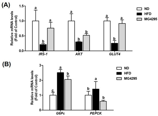 The effect of L. fermentum MG4295 on insulin and gluconeogenesis signaling pathway-related gene expression in the liver and muscle via qPCR was assessed (Figure 5). Compared to the ND group, the HFD-induced group exhibited significantly downregulated the mRNA expression of IRS-1, AKT, and GLUT4 (0.21-, 0.30-, and 0.26-fold of control, respectively, p < 0.05) and upregulated the mRNA expression of G6Pc and PEPCK (2.52- and 1.42-fold of control, respectively). Conversely, administration of L. fermentum MG4295 significantly upregulated IRS-1 and GLUT4 mRNA expression (0.76- and 0.91-fold of control, respectively), and G6Pc and PEPCK mRNA expression was significantly decreased (2.06- and 0.59-fold of control, respectively). For HFD-induced group and L. fermentum MG4295-treated group in AKT (0.52-fold of control), mRNA expression showed no significant difference. In AKT mRNA expression, the L. fermentum MG4295 group increased that of levels.