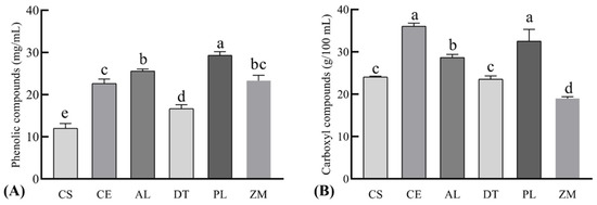 The concentrations of phenolic (A) and carbonyl compounds (B) determined in prepared liquid smoke from five different woods. CS, commercial liquid smoke; CE, Cupressus funebris Endl; AL, Armeniaca vulgaris Lam; DT, Diospyros kaki Thunb; PL, Punica granatum L.; ZM, Ziziphus jujuba Mill. Bars lacking common letters differ at p < 0.05, n = 6.