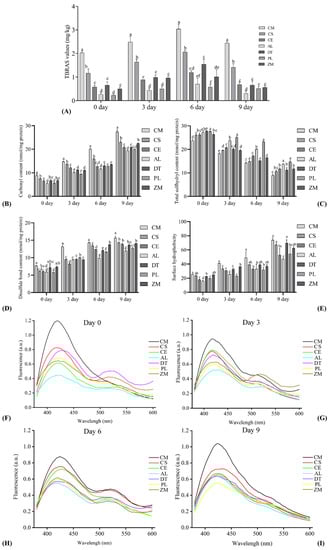 Hydrophobic interaction between non-polar amino acid residue side chains is the main reason for protein folding into the tertiary structure. Oxidation of protein sulfhydryl groups alters protein conformation and the surface hydrophobicity increases [46]. From Figure 3E, it can be told that surface hydrophobicity of proteins in meat tended to increase during the whole period of storage. On day 3, the unsmoked cured meat had higher (p < 0.05) surface hydrophobicity than all the smoked bacon, indicating a higher degree of protein oxidation in CM and liquid smoke inhibited protein oxidation in bacon. Again, the lower protein surface hydrophobicity in AL and PL groups compared to the DT and CS groups confirmed liquid smoke prepared from AL and PL woods had higher antioxidant capacity (Figure 2A–D) and inhibited sulfhydryl oxidation (Figure 3C).