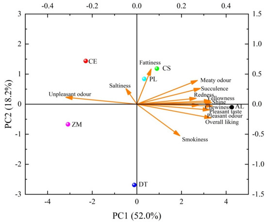 Principle component analysis (PCA) for sensory attributes of bacon smoked with different woods. CS, commercial liquid smoke; CE, Cupressus funebris Endl; AL, Armeniaca vulgaris Lam; DT, Diospyros kaki Thunb; PL, Punica granatum L.; ZM, Ziziphus jujuba Mill.