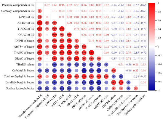The correlation analysis of smoke antioxidant capacity and oxidation in bacon. The data of phenolic and carbonyl compounds in liquid smoke, the antioxidant capacity of both liquid smoke and freshly prepared bacon (day 0), and oxidation of lipids and proteins on day 9 were used for correlation analysis. Red represents positive correlation. Blue represents negative correlation. LS, liquid smoke. * p < 0.05; ** p < 0.01; *** p < 0.001.