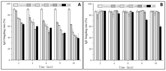 The IgG and IgE binding abilities of OVM were estimated through indirect competitive ELISA with sera from rabbit and EWA patients, respectively. As shown in Figure 1A, the IgG binding rate of SS-treated OVM samples significantly decreased with the increase of SS temperature and processing time. The IgG binding rate was markedly influenced by high temperatures and long periods of treatments, with a maximum decline to 28% when treated at 200 °C for 10 min. The reduction in the IgG-binding ability of OVM may be due to the structural changes derived from amino acid modification and denaturation [15]. The results implied that SS-created extreme high temperatures of up to 200 °C might influence the protein structure and destroy IgG allergenicity epitopes.