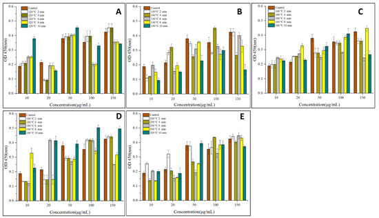 To analyze the potential cytotoxic activities of the tested substances, KU812 cells were incubated for 24 h with increasing concentrations of OVM treated by SS at different temperatures and periods. As shown in Figure 2, compared with the control sample, the absorbance (OD450) of cells increased after SS treatment, suggesting that SS heating can promote KU812 cells proliferation. Generally, the absorbance (OD450) of cells increased with the increase of OVM concentration and SS processing period. These suggested that a higher OVM concentration and longer SS processing period promoted the KU812 cells proliferation.