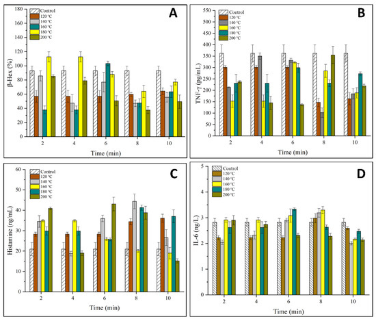 Histamine is another key mediator found in KU812 cell granules which is released during antigen-specific IgE binding and plays an important role in the induction of adverse physiological symptoms of an allergic reaction [25]. Interestingly, compared with β-hex, a higher concentration of histamine was observed with OVM treated by SS at 120–200 °C for 2–10 min, except for several samples that showed negligible changes. Previous studies have reported similar findings on changes in the β-hex and histamine release, which suggested that histamine may not be a good indicator of mast cell degranulation in regard to OVM [24].
