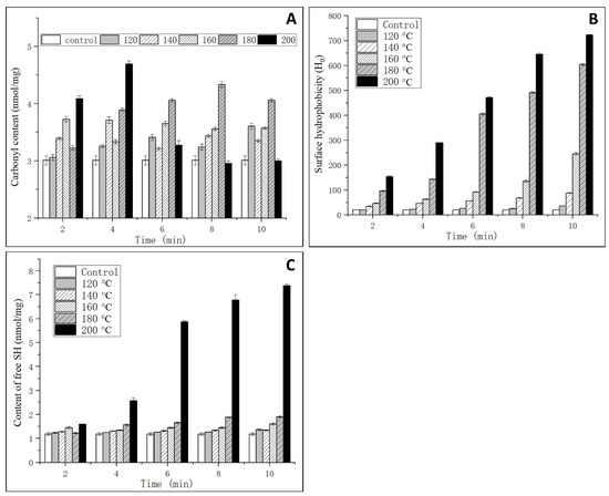 Generally, the content of carbonyl is an oxidative indicator of the protein [18]. In this study, the oxidation degree of OVM was analyzed through the determination of the contents of carbonyl and free SH. As shown in Figure 4A, a significant increase of the carbonyl content was observed with the rise of temperature and extension of processing time at 120–160 °C for 2–6 min and 200 °C for 2–4 min. No significant change was observed in OVM treated by SS at 200 °C for 6–10 min. In an environment of high temperature and high humidity, vaporized water molecules could react with oxygen ions, which will induce the protein backbone of amino acid residue to form peroxyl radicals. Subsequently, carbonyl derivatives were produced via an amidation reaction [26]. However, when the temperature was increased up to 200 °C and the processing time reached 6–10 min, large amounts of protein aggregation were generated, which influenced the monitoring of the carbonyl content.