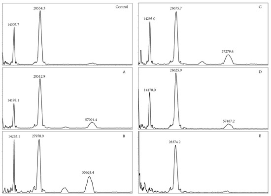MALDI TOF MS of OVM treated by SS at different temperatures (Control, native OVM; (A–E), OVM treated with SS at 120, 140, 160, 180 and 200 °C, respectively, for 10 min).