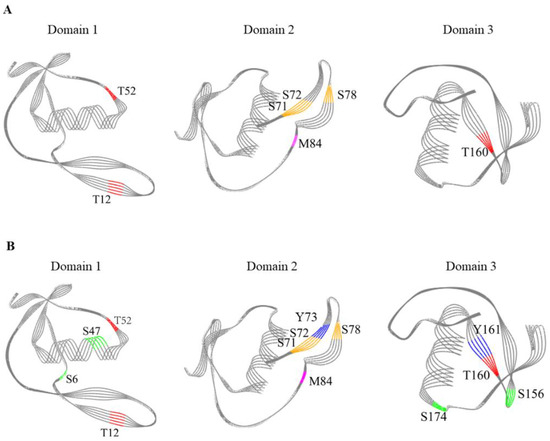 Modification sites in 3D diagrams of the three domains of SS-treated OVM. (A), 120 °C for 10 min and 140 °C for 10 min; (B), 200 °C for 10 min; purple, oxidation modification; blue, nitro modification; red, phosphorylation; orange, glygly modification; green, sulfo modification.