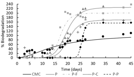 3.5. Biodegradation Kinetics under Laboratory-Scale Composting Conditions