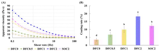 The apparent viscosities of the coating solutions are shown in Figure 1A. The apparent viscosity of the coating solution was significantly affected by the type of lipid and the addition of chitosan, where DFC2 exhibited the highest apparent viscosity among the groups (p < 0.05). This can be explained by the melting point of duck fat. In a previous study, duck fat-added margarine had higher apparent viscosity than soybean oil-added margarine due to the higher melting point of duck fat (6.21 °C) than that of soybean oil (−22.59 °C) []. The chitosan content also affected the apparent viscosity of the coating solution. This can be explained by the degree of chain entanglement in the coating solution. As the polymer concentration increases, the freedom of movement of polymer chains is restricted because of the correspondingly greater entanglement [].