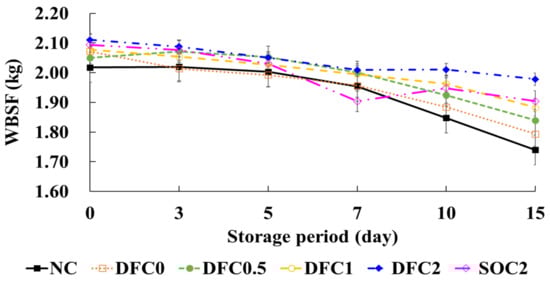 Warner–Bratzler shear force (WBSF) of coated chicken meat during storage at 4 ± 1 °C for 15 days. NC, non-coated; DFC0, coated with duck fat, with no chitosan; DFC0.5, coated with duck fat and 0.5% chitosan; DFC1, coated with duck fat and 1% chitosan; DFC2, coated with duck fat and 2% chitosan; SOC2, coated with soybean oil and 2% chitosan. The error bars indicate SD (n = 3).