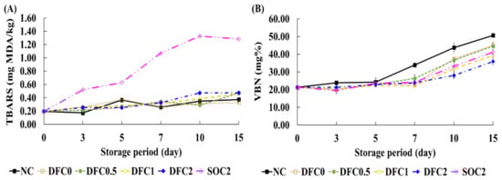 Shelf-life and the quality of meat are highly associated with lipid oxidation and protein deterioration during storage []. TBARS values are used for measuring the formation of secondary oxidation products, including malondialdehyde, alkenals, and alkadienals []. Variations in the TBARS values of the meat samples are shown in Figure 3A. The difference in TBARS values between DFC treatments and SOC2 can be explained by the fatty acid profiles of duck fat and soybean oil in the coating solution. Duck fat is more stable against lipid oxidation than soybean oil during storage because the main fatty acids in duck fat and soybean oil are oleic acid and linoleic acid, respectively []. The oxidative stability of oleic acid in edible oils is almost 10-times greater than that of linoleic acid []. Therefore, the higher resistance to oxidation of duck fat could be more suitable as an edible coating material than soybean oil.