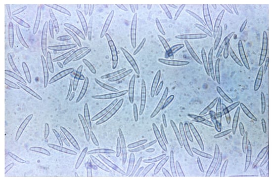 Fusarium is a filamentous fungus, introduced for the first time by Link in the year 1809 as Fusisporium (Figure 1) []. It can produce a vast number of plant diseases, including root or stem rots, cankers, wilts, fruit or seed rots and leaf diseases []. Fusarium infestation is not limited to a particular region, being equally difficult to control in areas with a temperate climate as well as in tropical areas []. Cereal crops are mainly affected by grain and seed blights, most often caused by F. graminearum and F. culmorum in wheat and barley, F. verticillioides in maize and F. thapsinum in sorghum, leading to yield losses and mycotoxins production []. Besides the type of cereal, the adopted agricultural practices together with the weather conditions over each year greatly define the Fusarium population to be developed in each geographical region []. Some researchers also suspect a considerable modification in both the fungal profile and plants’ response to the infection due to climate change [].