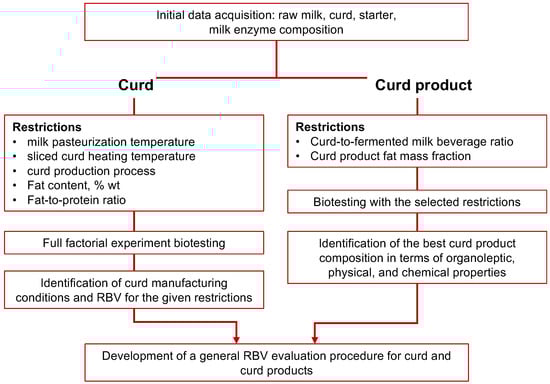 Using the express method for assessing the RBV and the selected optimality criteria, in this study, we adapted the methodology for the RBV assessment of fermented milk products developed by the authors for the technologies of curd and curd products. The parameters of the technological process for the production of curd, which were chosen as limitations, were analyzed: milk pasteurization temperature; clot heating temperature after cutting; ways of producing curd; the ratio of the mass fraction of protein and fat in curd; and the mass fraction of fat in curd. Based on the experiments performed, the most significant parameters are the milk pasteurization temperature and the clot heating temperature. As a result of a full factorial experiment, the optimal regime for obtaining curd for maximizing the RBV was established. The temperature of pasteurization of milk is 81 °C, and the temperature of heating the curd is 54 °C with the acid method of producing curd. This regime, all other things being equal, provides an RBV of at least 282%. In addition, the biotesting method confirmed the percentage of components for the design of curd products. A methodology for designing effective technologies for curd and curd products was developed. It is quite possible that the results obtained would differ if the research is continued with more raw milk or if other types of milk (for example, reconstituted) or other types of curd obtained by separation or ultrafiltration or heat-treated curd products (with a long shelf life) are investigated. Despite this, the results obtained can be used in the production of curd currently produced by enterprises on existing equipment.