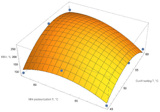 where RBV is the resulting biological value, is the milk pasteurization temperature, and is the curd heating temperature. Figure 5 shows this relationship as a response surface.