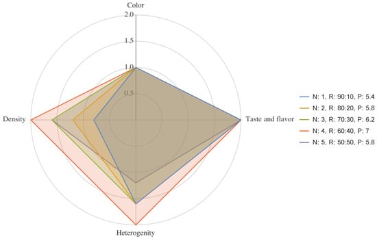 Diagram of the curd product organoleptic properties. N: sample group number, R: curd-to-fermented-dairy-beverage ratio, p: final score, points.