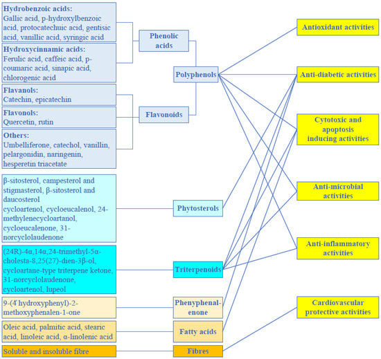 | Anti-diabetic activities | Total phenolics; phenolic acids | extracts with water and different organic solvents | In Ehrlich ascites tumor cells, extracts had various degrees of stimulatory effects on glucose uptake | As a potential antidiabetic agent | [54] |
