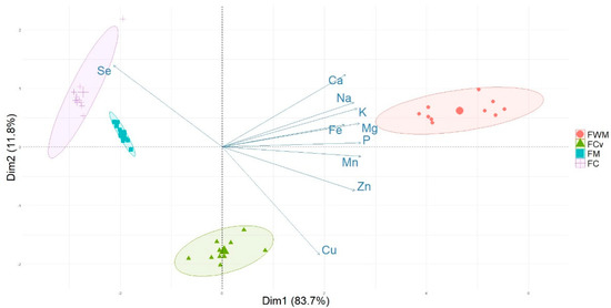 When examining the score plot of the samples in the space defined by the two principal components considered (Figure 1), a separation between refined-wholegrain flours was observed due to their contrasting behavior in terms of the element content. With the exception of Se, FWM showed higher element content, and the refined flours (FM and FC) presented the lowest element content except Se. For Se, the behavior was the opposite; Se was higher in the case of FM and FC flours and lowered in the case of FWM.