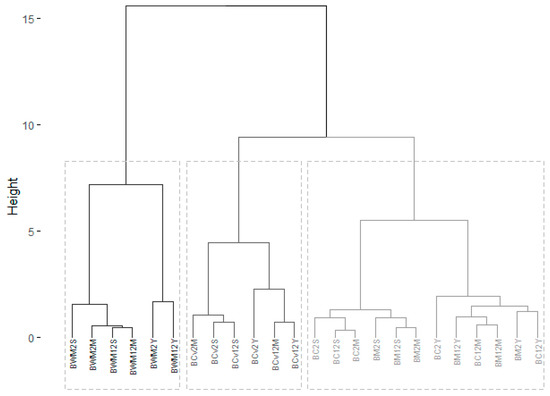 Dendogram for cluster analysis (BWM2S: 75% FC + 25% FCv wholemeal mixed flour/2 h fermentation/sourdough; BWM2M: 75% FC + 25% FCv wholemeal mixed flour/2 h fermentation/mixed leavening; BWM2Y: 75% FC + 25% FCv wholemeal mixed flour/2 h fermentation/yeast; BWM12S: 75% FC + 25% FCv wholemeal mixed flour/12 h fermentation/sourdough; BWM12M: 75% FC + 25% FCv wholemeal mixed flour/12 h fermentation/mixed leavening; BWM12Y: 75% FC + 25% FCv wholemeal mixed flour/12 h fermentation/yeast; BM2S: 75% FC + 25% FCv refined mixed flour/2 h fermentation/sourdough; BM2M: 75% FC + 25% FCv refined mixed flour/2 h fermentation/mixed leavening; BM2Y: 75% FC + 25% FCv refined mixed flour/2 h fermentation/yeast; BM12S: 75% FC + 25% FCv refined mixed flour/12 h fermentation/sourdough; BM12M: 75% FC + 25% FCv refined mixed flour/12 h fermentation/mixed leavening; BM12Y: 75% FC + 25% FCv refined mixed flour/12 h fermentation/yeast; BCv2S: 100% refined ‘Caaveiro’ variety/2 h fermentation/sourdough; BCv2M: 100% refined ‘Caaveiro’ variety/2 h fermentation/mixed leavening; BCv2Y: 100% refined ‘Caaveiro’ variety/2 h fermentation/yeast; BCv12S: 100% refined ‘Caaveiro’ variety/12 h fermentation/sourdough; BCv12M: 100% refined ‘Caaveiro’ variety/12 h fermentation/mixed leavening; BCv12Y: 100% refined ‘Caaveiro’ variety/12 h fermentation/yeast; BC2S: 100% refined ‘Castilla’ variety/2 h fermentation/sourdough; BC2M: 100% refined ‘Castilla’ variety/2 h fermentation/mixed leavening; BC2Y: 100% refined ‘Castilla’ variety/2 h fermentation/yeast; BC12S: 100% refined ‘Castilla’ variety/12 h fermentation/sourdough; BC12M: 100% refined ‘Castilla’ variety/12 h fermentation/mixed leavening; BC12Y: 100% refined ‘Castilla’ variety/12 h fermentation/yeast).