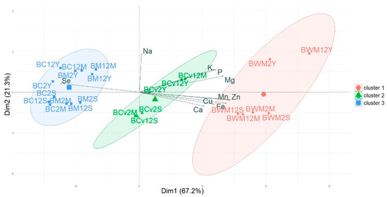 In cluster 3, composed of breads made with refined flours (BM2S, BM12S, BM2M, BM12M, BM2Y, BM12Y, BC2S, BC12S, BC2M, BC12M, BC2Y, BC12Y), the behavior of the elements was opposite that of the wholegrain breads. This category was characterized by breads having a below-average element content as evidenced in the negative v-test for all of them except Se. In these breads, Ca presented the least significant p-value.