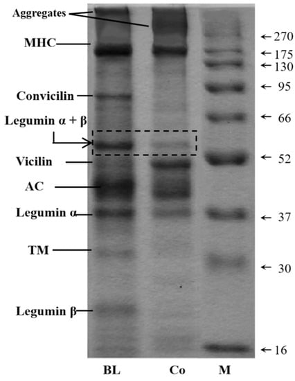 Non-reducing electrophoresis cannot disrupt the disulphide bonds. Therefore, it reflects the original composition of the various proteins in a mixed protein (Figure 1 and Table 2), and both BL and Co contained myosin heavy chain (MHC, ~200 kDa), convicilin (~70 kDa), legumin (~62 kDa), vicilin (~50 kDa), actins (AC, ~42 kDa), legumin α (~38 kDa), tropomyosin (TM, ~34 kDa), and legumin β (~22 kDa), all aggregates consistent with the literature [25,26]. Compared with legumin α + β, vicilin is more flexible and exhibits higher interfacial activity [27]. Many studies have confirmed that the vicilin/legumin a + B ratio is positively related to a protein’s functional properties, including solubility and foaming and emulsifying properties [28,29]. Thus, the ratio of vicilin to legumin a + β is very important. As shown in Table 2, the proportion of Co (203.99%) is 2.82-fold larger than that of BL (72.36%). Therefore, the analysis of protein composition indicates that the functional properties of Co might be superior to those of BL.