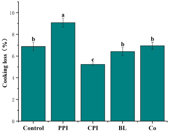 The effect of adding different protein pre-emulsified soybean oil on the CL of fish sausage is shown in Figure 2. In this study, due to different emulsifiers, the introduction of soybean oil in the form of protein pre-emulsification will affect CL. CPI fish sausage had the lowest cooking loss (5.24%, p < 0.05), indicating that adding fish protein homologous to the fish-sausage matrix in the pre-emulsification emulsion can reduce cooking loss [31]. Compared with the control group, the cooking loss of PPI fish sausage was higher (p < 0.05). This is similar to the finding that replacing pig fat with pre-emulsified olive oil stabilised by soy protein isolate increased cooking loss. This is because the plant protein in fish sausage is not tightly bound to the fish matrix, resulting in a loose structure of the sausage that makes it difficult to hold water [32]. However, there was no significant difference in the CL of BL and Co when compared with the control group (p > 0.05). It can be seen that the introduction of plant protein in the form of dual proteins in fish sausage can significantly reduce CL.