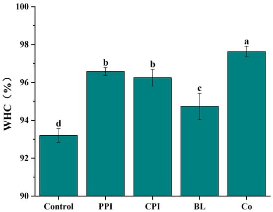 The WHC can reflect the cross-linking degree of the blend gel of pre-emulsified protein and fish meat. The effect of soybean oil pre-emulsified with four kinds of proteins on the water-holding capacity of fish sausage is shown in Figure 3. The results showed that the WHC of the five kinds of fish sausage was greater than 93%, with the control group having the lowest (93.20% p < 0.05), indicating that increased protein concentration results in a stronger gel network. This is consistent with the results reported in the literature [33]. The WHC of Co-, PPI-, and CPI fish sausage was higher than 96.00%. Under centrifugation, the water in the capillary of the gel permeates the surface and is removed by filter paper. Therefore, it can be considered that the addition of Co, PPI, and CPI reduces the flow of free water [34]. In addition, the WHC of Co fish sausage was the highest, while that of BL fish sausage was the lowest. Combined with the previous results [18], we speculate that this is due to the antagonistic effect of PPI and CPI in BL on heat-induced gelation, which leads to a loose structure and poor WHC of fish sausage. It can be seen that Co is more beneficial to the water retention of fish-sausage gels than BL.