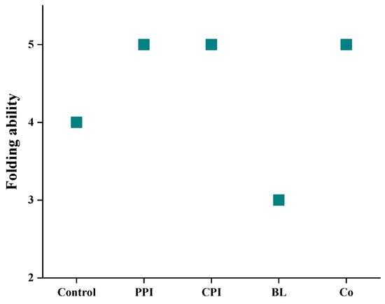 The folding test can directly reflect the gel strength of fish sausage and allow researchers to quickly understand its texture characteristics [35]. The folding test results of the five kinds of fish sausages are shown in Figure 4, which confirms the results of CL and WHC. The folding ability of the control group was lower than that of PPI-, CPI-, and Co fish sausage, which was attributed to the weak gel network formed by the lower protein content [36]. However, the lowest folding ability of BL fish sausage was only level 3 (p < 0.05). This is due to the antagonism of PPI and CPI in BL, leading to the gel structure loosening.