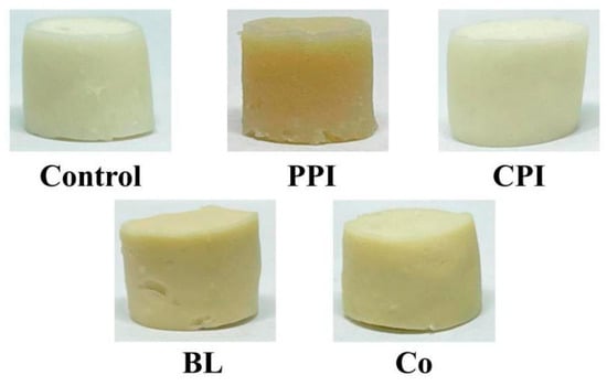 Colour impacts its application in food, and colour tests can objectively evaluate the colour of protein samples. L* represents sample brightness; the positive value of a* denotes redness, and the negative value represents greenness. A positive value of b* is yellowness, and a negative value is blueness. The effect of different protein pre-emulsified soybean oil on the colour of fish sausage is shown in Figure 5 and Table 5. The brightness (L*) and whiteness of PPI fish sausage were lower than those of the other groups (p < 0.05), and yellowness (b*) was higher than those in other groups (p < 0.05). This is related to the yellowish colour of PPI, which is attributed to the natural yellow plant pigments in peas that are thermally stable. The brightness (L*) of CPI fish sausage was the highest, reaching 86.37 (p < 0.05), and the yellowness (b*) was the lowest (p < 0.05), but the whiteness was significantly higher than that of other groups (p < 0.05) [40]. The redness/greenness (a*) of the fish sausage was lower in the five groups, which had little influence on the colour. The four colour indices of the fish sausage in the control group, i.e., BL and Co, were all between PPI and CPI, indicating that the relative white of CPI had a masking effect on the relative yellow of PPI [41]. Therefore, adding plant protein in the form of dual proteins can reduce the adverse effect of yellow pigments in plants on fish sausage, and the colour quality of BL is superior than that of Co.