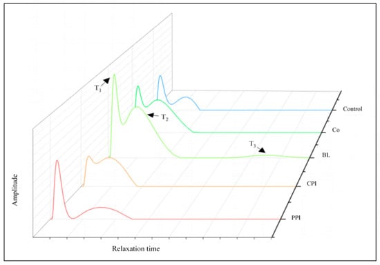 Low-field nuclear magnetic resonance (LF-NMR) is a useful method to study the content, state, distribution, migration, diffusion, and the interaction of water molecules with other molecules. These properties of water are the key factors in determining the quality of fish-sausage gel [42]. Figure 6 shows the effect of soybean oil pre-emulsified with different proteins on water distribution in fish sausage. The relaxation time T of hydrogen protons in fish sausage reflects their degree of binding or freedom. The higher the T, the lower the binding force of hydrogen protons, leading to decreased stability and increased fluidity. The peak area of each stage represents water content with a different binding degree in fish sausage. T1 represents the bound water tightly adsorbed with macromolecules such as protein; T2 represents the water locked in the gel network of fish sausage, which has a certain fluidity and is classified as not easily allowing the flow of water; and T3 represents the water outside the gel network structure of fish sausage: free water with high fluidity [43]. It can be seen from Figure 6 that the T1 peak area of fish sausage containing pea protein components, such as PPI-, BL-, and Co fish sausage, is more significant. This may be due to the existence of pea protein in the gel in the form of filling after emulsification, and the degree of interaction with the gel matrix is weak. In contrast, the adsorption capacity of plant protein (PPI) to water is considerably stronger than that of fish protein, resulting in a higher volume of bound water (T1) [44]. Only the BL fish sausage had a pronounced T3 peak, indicating that it had a high free-flowing water content and a low gel water-holding capacity. However, the difference between T1 and T2 peaks of CPI fish sausage was not noticeable, and the peak distribution was similar to that of the control group, indicating that the CPI bonded well with the fish gel matrix during gelation, leaving appropriate gaps to lock the adsorbed water in the gel network [45]. Generally speaking, the water distribution of Co fish sausage was between that of CPI- and PPI fish sausage, with no discernible T3 peak. Again, BL fish sausage showed an antagonistic effect.