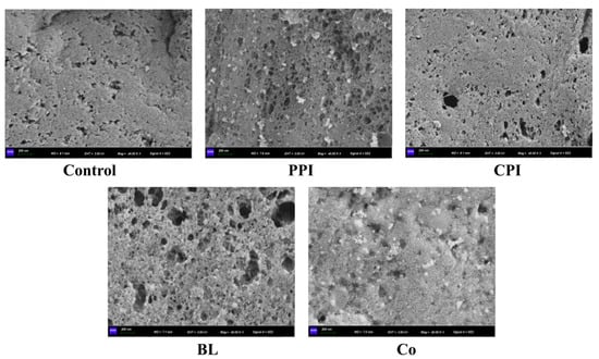 The TPA results of the five sausage samples are shown in Table 4. The hardness, cohesiveness, and chewiness of fish sausage added with Co were significantly higher than those of PPI and CPI (p < 0.05), which indicated the synergistic effect of Co. According to previous studies [18], it is speculated that disulphide bonds account for the highest proportion of intermolecular forces of Co gel, which makes the hardness and cohesion of Co fish sausage stronger and thus necessitating greater energy consumption during chewing. However, the thermal denaturation temperature of PPI (82 °C) [37] and CPI (56 °C) [38] contained in BL is obviously different, which leads to the loose structure of heat-induced gel formed by BL, which leads to the lowest hardness, cohesion, and chewiness of BL fish sausage (p < 0.05), showing an obvious antagonistic effect. The hardness, cohesion, and chewiness of the blank control group were the lowest, but the springiness was the highest (p < 0.05). This is similar to the research results of improving the texture characteristics of fish sausage by adding pea protein [39]. Adding protein can enhance the interaction between protein molecules in surimi gel, thus improving the texture characteristics of the gel.