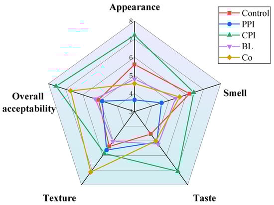 Texture was the main attribute that affected consumer preferences [51]. The texture score of Co fish sausage was higher than CPI (p < 0.05), and the overall acceptability was second only to CPI, indicating that the colour and smell of pea components would affect the sensory quality of the fish sausage. It is noteworthy that the overall acceptability, texture, and smell of Co fish sausages are significantly higher than those of PPI- and BL fish sausages. The results were consistent with the folding test level, WHC, and texture properties, which again indicated that Co addition was a more ideal method for introducing plant protein compared to PPI and BL.