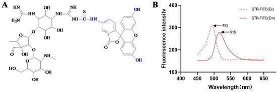 (A) Molecule of STR-FITC and (B) its fluorescence spectrum. STR-FITC is the conjugate of streptomycin (STR) and fluorescein isothiocyanate (FITC). STR-FITC (Ex) is the excitation wavelength of STR-FITC, and STR-FITC (Em) is emission wavelength of STR-FITC.