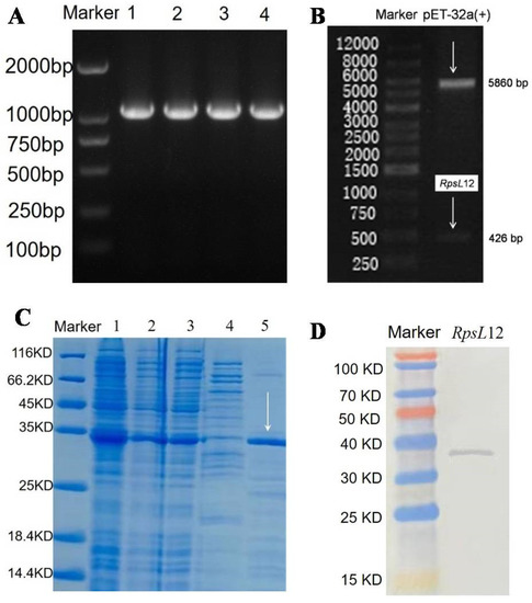 In this study, the L. sphaericus RpsL12 gene was directly inserted into pET32a(+) to synthesize the expression vector. As shown in Figure 3A, the expected RpsL12 gene was obtained (1138 bp, containing the target RpsL12 gene 426 bp and the T7 primer 712 bp). As shown in Figure 3B, the expected genes of pET32a(+) (5860 bp) and RpsL12 (426 bp) after enzyme digestion were also obtained. Then the pET32a-RpsL12 was expressed in Escherichia coli BL21(D3). As shown in Figure 3C, the RpsL12 was expressed in both the inclusion body and the supernatant (molecular weight 34 kDa). For convenience, the RpsL12 in the supernatant was purified for the subsequent experiments. As shown in Figure 3D, the results of a Western blotting experiment showed the target protein was obtained. Furthermore, its 100% conserved amino acids were the same as the RpsL12 from other bacterial strains (Figure S1, Supplementary Materials). These results showed that the target RpsL12 was obtained.