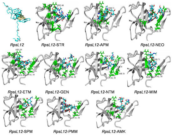 General considerations of the results are shown in Table 1 and Figure 4. VAL38 from β2 (interacting with 7 AGs) and SER40 from β3 (interacting with 6 AGs) constructed the pocket bottom; GYL27 from β1 (interacting with 5 AGs) and TYR28 from β1 (interacting with 6 AGs) constructed one side of the pocket, and GLN42 from β3 (interacting with 5 AGs), LYS43 from β3 (interacting with 5 AGs) and ARG44 from β3 (interacting with 6 AGs) and THR71 from β4 (interacting with 5 AGs) constructed the other side of the pocket. The positions of these contact amino acids were similar to the previous report [35]. As shown in Figure 1, the specific binding sites in the 10 AGs were different, and this may be because of their different molecular structures. Still, the binding energies of the RpsL12 for the 10 drugs were in a narrow range (5.15–5.84 kcal/moL, Table 1), indicating that the RpsL12 showed comparable recognition for them.
