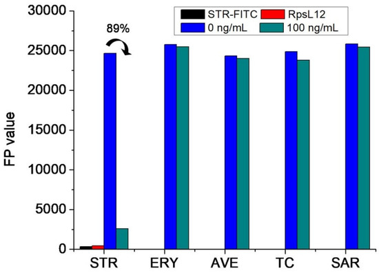 FP values when testing STR and other drugs by using STR-FITC (8 μg/mL) and RpsL12 (2 μg/mL) (pH 7.0; incubation time 5 min; ERY = erythromycin, AVE = avermectin, TC = tetracycline, SAR = sarafloxacin).