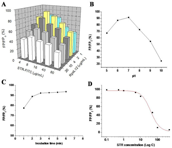 Results for optimization of (A) RpsL12/STR-FITC concentration (pH 7.0, incubation 5 min), (B) pH (STR-FITC 8 μg/mL, RpsL12 2 μg/mL, incubation 5 min), and (C) incubation time (STR-FITC 8 μg/mL, RpsL12 2 μg/mL, pH 7.0) by using STR (100 ng/mL). (D) Competitive inhibitory curve of STR (0.1–500 ng/mL).