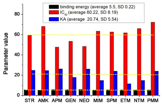 For an overview of the method sensitivity and RpsL12 recognition ability, the binding energy (5.15–5.84 kcal/moL), KA (11.358–26.102), and IC50 (47.6–72.2 ng/mL) of the 10 AGs were integrated. As shown in Figure 7, the average value of the binding energy was 5.5 with a standard deviation of 0.22, the average value of KA was 60.22 with a standard deviation of 8.19, and the average value of IC50 was 20.74 with a standard deviation of 5.54. This meant that the three parameters for the 10 drugs were all in a narrow range, i.e., the RpsL12 showed comparable bindings, affinities, and sensitivities to the 10 drugs, which was the base to develop the multi-analytes FPA method for the 10 AGs.