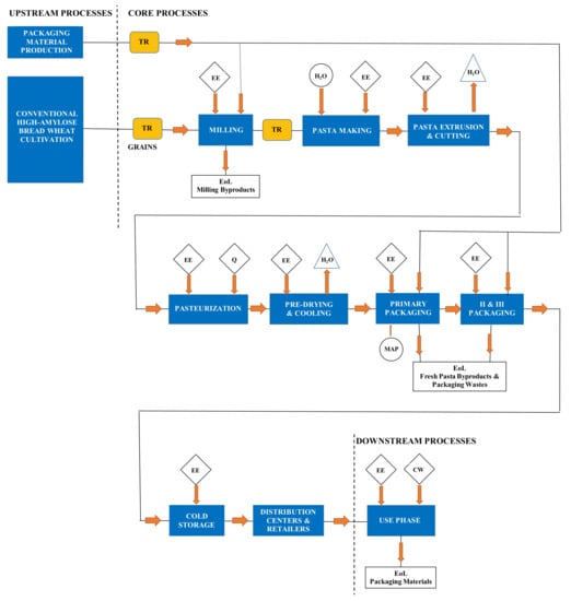 Pasteurized high-amylose fresh pasta system boundary, where the main processes are subdivided into upstream, core and downstream ones: CW, cooking water; EE, electric energy; EoL, end of life; H2O, process water; MAP, modified atmosphere packaging; Q, thermal energy; TR, transport.