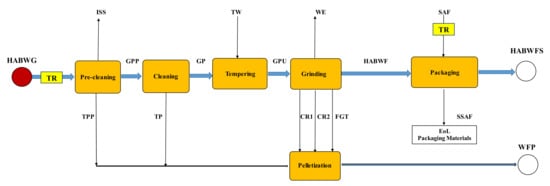 During milling, HABW grains were pre-cleaned, cleaned, tempered, and then ground to break down the endosperm into fine particles (white flour) and several byproducts, such as bran, middlings, meal, germ, and groats. Figure 2 shows the block diagram of the HABW milling process, where the symbols used for all the streams accounted for are listed in the Nomenclature section.