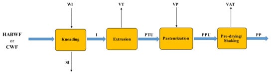 Figure 3 shows the block diagram of the pasta making process. The dough (I) was prepared by mixing the raw material, that is high-amylose bread wheat flour (HABWF) or common wheat flour type 00 (CWF), with water directly in the mixer. The hydration ratio was equal to 0.37 kg of water per kg of HABWF [], or to 0.25 kg of water per kg of CWF, as generally used in the fresh pasta industry mentioned above. The dough waste (SI) was assumed as equal to 0.4% (w/w) of the dough produced (I), as measured in industrial pasta making tests []. The dough (I) was then transferred to the extruder and forced through dies to obtain pasta strands of different shapes and sizes (PTU). Despite water cooling jackets allowing the heat produced during the extrusion process to be removed to maintain the dough temperature near to 50 °C, wet pasta (PTU) reduced its moisture content to 31% (w/w). Extruded wet pasta strands were conveyed to the pasteurizer by means of stainless-steel mesh conveyor belts. Injection of saturated steam allowed such strands to be heated up to 87 °C for about 3 min to reduce the bacterial population. Pasteurized fresh pasta was then loaded into a pre-dryer to reduce its humidity to 24% (w/w) in compliance with the provisions of art. 9 of Presidential Decree no. 187/2001 []. Thereafter, a continuous ventilation process enabled pasteurized fresh pasta to be cooled to 4–6 °C. Table S8 shows the partial and total material balances of the fresh pasta making, pasteurization, and pre-drying steps.