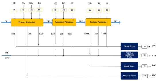 Figure 4 shows the block diagram for the packaging process examined in this work, showing also all the solid wastes generated, while Table 3 gives all the details about the primary, secondary, and tertiary packages used.