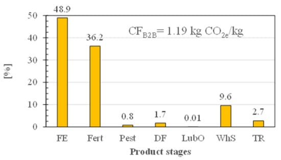Owing to the growing interest of the general consumer towards the environmental impact of the foods and beverages daily consumed, the major Italian pasta manufacturers (i.e., Barilla Group and De Cecco SpA) have started to assess the environmental impact of dry pasta production using the Environmental Product Declaration methodology [], as reported online at https://www.environdec.com/ (12 October 2022). The cradle-to-grave environmental impact of dry pasta production was originally assessed by Bevilacqua et al. []. After that several life-cycle assessment (LCA) studies were carried out, as reviewed by Renzulli et al. []. Some of these were of the business-to-business type [,,,], while others were cradle-to-grave types [,,,,,,]. According to Barilla [], the business-to-consumer carbon footprint (CFB2C) of 1 kg of durum wheat semolina dry pasta in paperboard boxes was of the order of 1.9 or 3.0 kg CO2e, depending on the use of a gas or electric stove, respectively. Durum wheat cultivation represented 32 or 20% of CFB2C, while pasta cooking, embodying 31 or 56% of CFB2C, was the most impacting phase of the overall life cycle of dried pasta. Moreover, the cradle-to-grave environmental profile of an organic pasta production chain, estimated in compliance with the Product Environmental Footprint standard method [] and specific category rules for dry pasta [], was characterized by an overall weighted eco-indicator of 195 μPt/kg, this being about 40% higher than that of conventional pasta (~141 μPt/kg) []. Both eco-indicators were mainly affected by the field phase (57% vs. 45%, respectively) and then by the pasta cooking one (23% vs. 30%).