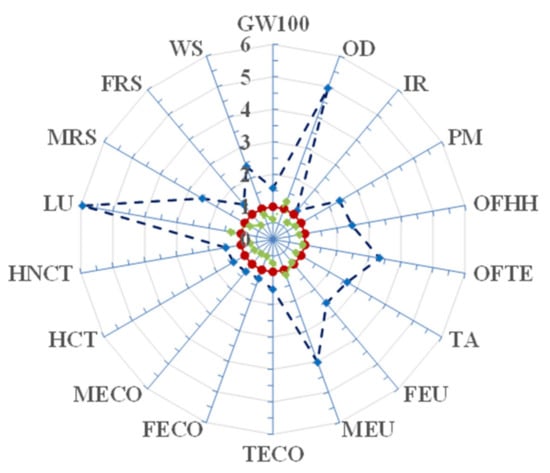 In particular, the characterization factors of the single environmental impact category (i.e., global warming) considered by the PAS 2050 standard method coincided with the 100-year time-horizon global warming potentials, as extracted from IPCC []. On the contrary, the updated ReCiPe 2016 method [] included the following 18 midpoint impact categories, their reference substance being shown in brackets: global warming (kg CO2e); stratospheric ozone depletion (kg CFC-11e); ionizing radiation (kBq 60Coe); fine particulate matter formation (kg PM2.5e); ozone formation-human health and -terrestrial ecosystems (kg NOxe); terrestrial acidification (kg SO2e); freshwater (kg Pe) and marine (kg Ne) eutrophication; terrestrial, freshwater, and marine eco-toxicity (kg 1,4-DCB); human carcinogenic and non-carcinogenic toxicity (kg 1,4-DCB); land use (m2 yr crope); mineral (kg Cue) and fossil (kg oile) resource scarcity; and water consumption (m3). Such mid-point impact categories can be aggregated to three endpoint indicators: (i) damage to human health (HH), expressed in DALY; (ii) damage to ecosystems (EQ), expressed in Loss of species during a year; (iii) damage to resource availability (RA), expressed in US$2013 to quantify the extra costs involved for future mineral and fossil resource extraction. These damage categories were then normalized with respect to the global population and finally might be grouped into the individualistic, hierarchic, or egalitarian perspective, according to the “Cultural Theory” []. In this work, the hierarchic perspective was selected to estimate an overall weighted damage score (OWDS), since such a perspective is regarded as the most balanced one between future and present impacts, and risks and benefits [].