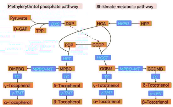 The biosynthesis of vitamin E mainly uses the shikimate metabolic (SK) pathway product, homogentisic acid (HGA) as a hydrophilic head, and uses the methylerythritol phosphate (MEP) pathway product phytyldiphosphate (PDP) or geranylgeranyl-diphosphate (GGDP) as a hydrophobic tail of tocopherol or tocotrienol [,]. At least seven enzymes are known to be directly involved in vitamin E synthesis. Firstly, 1-deoxy-D-xylulose-5-phosphate synthase (DXS) is the first speed limit enzyme of the MEP pathway. It can synthesize 1-deoxy-D-xylulose-5-phosphate (DXP) from the substrate D-glyceraldehyde-3-phosphate (D-GAP) and pyruvate with the aid of thiamine pyrophosphate (TPP), thus forming GGDP and PDP [,]. Moreover, 4-hydroxyphenyl pyruvate dioxygenase (HPPD) is the first key enzyme in the synthesis of vitamin E, which catalyzes the conversion of 4-hydroxyphenylpyruvate (HPP) into homogentisic acid (HGA) in the cytoplasm []. Next, homogentisic acid phytyltransferase (HPT) catalyzes HGA and PDP to form 2-methyl-6-phytylquinol (MPBQ). Then, MPBQ forms 2, 3-dimethyl-5-phytylquinol (DMPBQ) under the action of MPBQ methyltransferase (MPBQ-MT). γ-tocopherol and δ-tocopherol can be directly generated from MPBQ and MPBQ-MT under tocopherol cyclase (TC) catalysis, respectively. Then, α-tocopherol and β-tocopherol can be formed under the action of γ -tocopherol methyltransferase (γ-TMT) from γ-tocopherol and δ-tocopherol, respectively [,,,,]. On the other hand, homogentisate geranylgeranyltransferase (HGGT) catalyzes the formation of 6-geranylgeranyl-2-methylbenzene-1,4-diol (GGBM) from HGA and GGDP and then produces 6-geranylgeranyl-2,3-dimethylbenzene-1,4-diol (GGDMB). Next, δ-tocotrienol and γ-tocotrienol are directly converted from GGDMB and GGBM by TC. β-tocotrienol and α-tocotrienol can be directly generated from δ-tocotrienol and γ-tocotrienol by γ-TMT, respectively [,,,,].