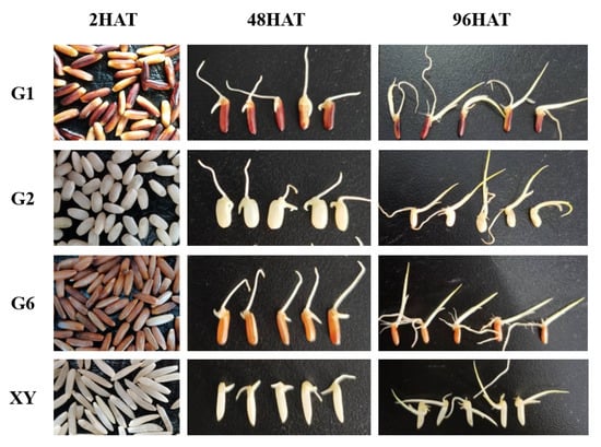 Treatment of germination: Firstly, impure, abortive, and damaged grains in the brown rice were removed. Secondly, the brown rice was rinsed in a plastic basin with tap water 5 times, the water was drained, the rice was disinfected by soaking in a 1% sodium hypochlorite solution for 15 min, this solution was drained, and the rice was then washed in ultra-pure water 5 times. Thirdly, the rice was soaked in an artificial climate chamber at 30 °C for 18 h, the liquid was poured out, and the soaked brown rice was placed on a sterilized tray with two layers of filter paper covering it to prevent moisture loss. The brown rice was germinated in an artificial climate chamber set at 30 °C, in a dark environment, with a relative air humidity of 80%, and it was sprayed with ultra-pure water every 6 h to keep it moist. Seeds of four different colored rice varieties i.e., Guanghei1 (G1), Guichao2 (G2), Guanghong6 (G6), and Xiangyaxiangzhan (XY), with dark brown, white, red, and white seed covers, respectively, were placed in Petri dishes. The sampling was conducted over three time intervals i.e., 2 h after seed soaking treatment (2HAT), 48 h after seed soaking treatment (48HAT), and 96 h after seed soaking treatment (96HAT). The morphological appearances of different brown rice varieties at different stages of germination are shown in Figure 2. Before each sampling, the seed surface was dried with paper towels and frozen in liquid N2 and stored at -80 °C for further analyses.