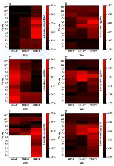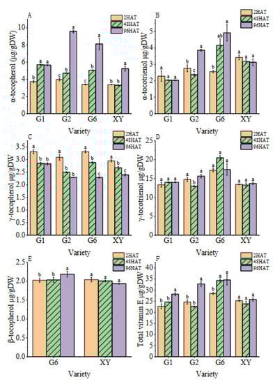 Furthermore, the content of γ-tocopherol decreased significantly with the prolongation of the germination time of brown rice. The content of γ-tocopherol in G1, G2, G6, and XY varieties at 96HAT significantly decreased by 14.57%, 25.86%, 30.86%, and 18.85% compared with 2HAT, respectively. The content of γ-tocotrienol decreased in the G2 cultivar at 48HAT, but there was no significant change in other cultivars at the germination stage. Significant differences among varieties were noted for β-tocopherol and β-tocotrienol. Both G6 and XY varieties produced β -tocopherol during the whole germination process of brown rice, the β -tocopherol content of G6 increased with the increase in germination time of brown rice, and the β -tocopherol content at 96HAT was significantly higher than that at 2HAT.